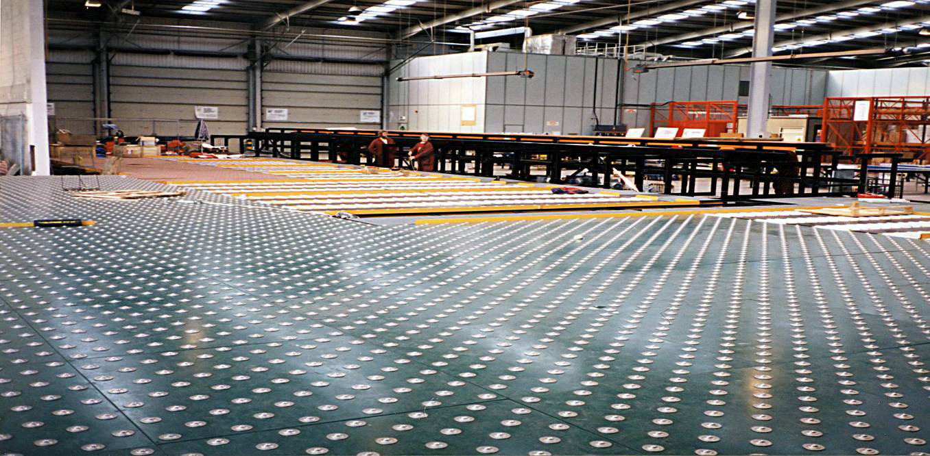 The modules comprise of a rigid frame fabrication incorporating steel top plates, located upon a rectangular hollow section steel framework. The assembled modules are installed and levelled to form a seamless working platform at any system height from 130mm to 508mm.